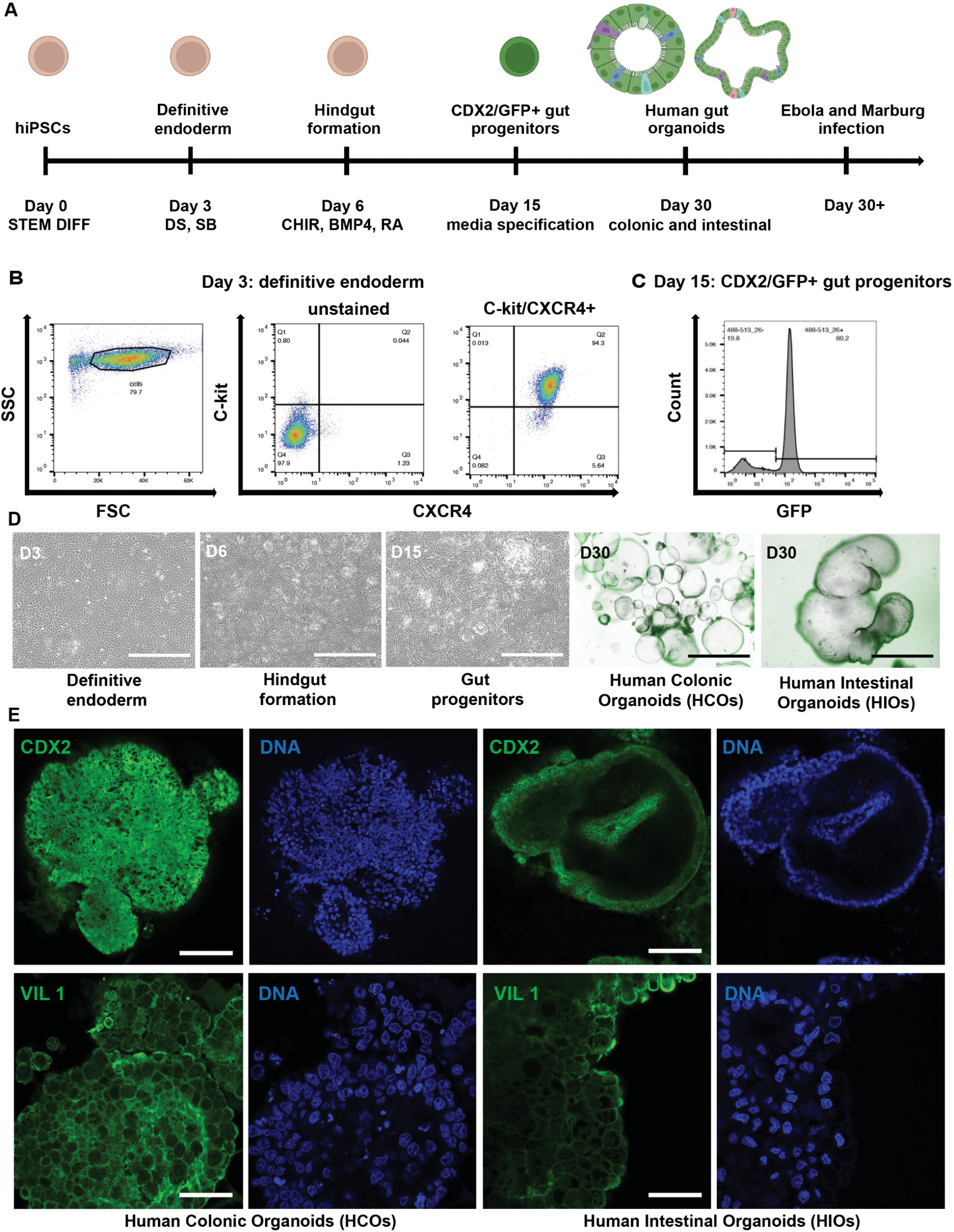 Figure 1: Directed differentiation of human iPSCs into region-specific intestinal (HIOs) and colonic (HCOs) organoids. (A) Schematic representation of the stepwise differentiation protocol used to generate gut organoids from human induced pluripotent stem cells (iPSCs). Illustrations created in BioRender. Muhlberger, E. (2025) https://BioRender.com/14baw98. (B) BU1 CDX2-GFP iPSCs were differentiated to definitive endoderm by day 3. (C) A CDX2-eGFP knock-in reporter line was used to monitor the emergence of hindgut progenitors during differentiation. (D) Gut progenitor cells were further specified into regional identities using defined media: colonic organoids (HCOs) were cultured in CKDCI media, and intestinal organoids (HIOs) were cultured in media containing CHIR, KGF, EGF, R-spondin, and Noggin. Brightfield and fluorescence imaging was performed at day 30 to visualize organoid morphology. Images were captured using a Keyence BZ-X710 fluorescence microscope. (E) Immunofluorescence staining was used to detect CDX2 and villin (VIL) (green) and Hoechst for nuclear staining (blue) in HIOs and HCOs. Confocal imaging was performed using a Zeiss LSM 710-Live Duo Confocal microscope with two-photon capability. Scale bars = 100 μm. Data shown are representative of n = 3 independent differentiations.