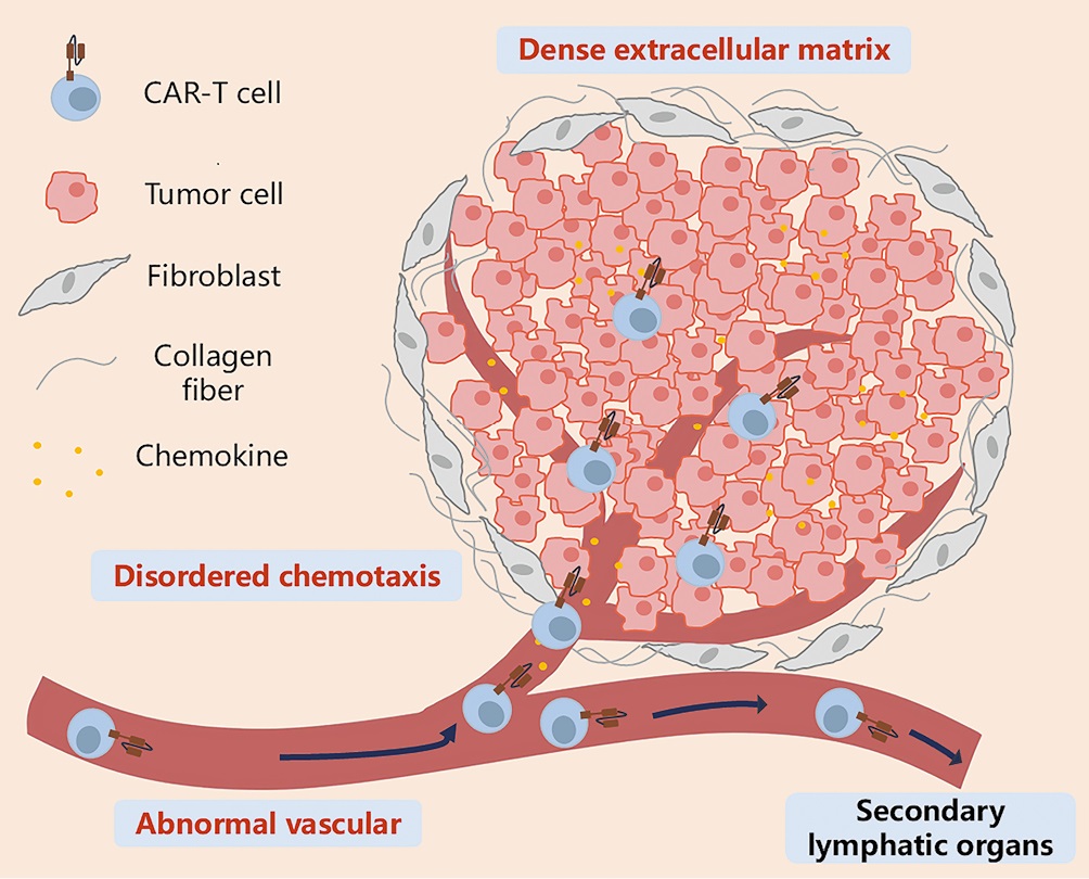 Figure 1: Key features that prevent CAR-T cells from infiltrating solid tumors through the circulation. CAR-T cells migrate to tumor tissues through the bloodstream under the guidance of chemokines, cross the abnormal tumor vasculature, penetrate the vicinity of tumor cells by overcoming barriers posed by the extracellular matrix and stromal cells, and ultimately generate stable intercellular contacts with tumor cells. During this process, disordered chemotaxis, abnormal tumor neovascularization, mesenchymal stromal cells dominated by cancer-associated fibroblasts, and a dense extracellular matrix are the main barriers that prevent CAR-T cells from effectively contacting tumor cells. CAR-T: Chimeric antigen receptor T.