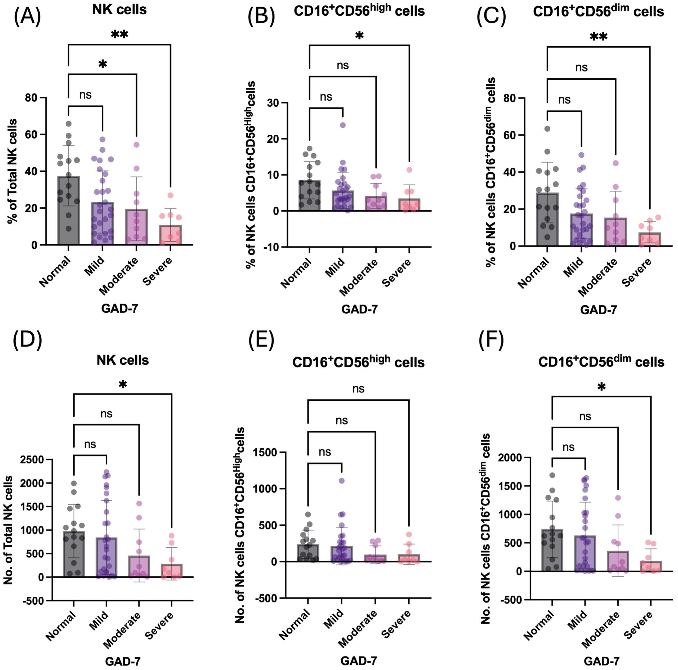 Figure 1: Anxiety has a negative influence on the percentage of peripheral NK cells and their subpopulation. (A) Percentage of total NK cells based on GAD-7 categories; mild, moderate, and severe compared to normal. (B) Percentage of CD16+CD56dim NK cells based on GAD-7 categories; mild, moderate, and severe compared to normal. (C) Percentage of CD16+CD56high NK cells based on GAD-7 categories; mild, moderate, and severe compared to normal. (D) Absolute cell number of total NK cells based on GAD-7 categories; mild, moderate, and severe compared to normal. (E) Absolute cell number of CD16+CD56dim NK cells based on GAD-7 categories; mild, moderate, and severe compared to normal. (F) Absolute cell number of CD16+CD56high NK cells based on GAD-7 categories; mild, moderate, and severe compared to normal. ns, non-significant, *<0.05, **<0.01.
