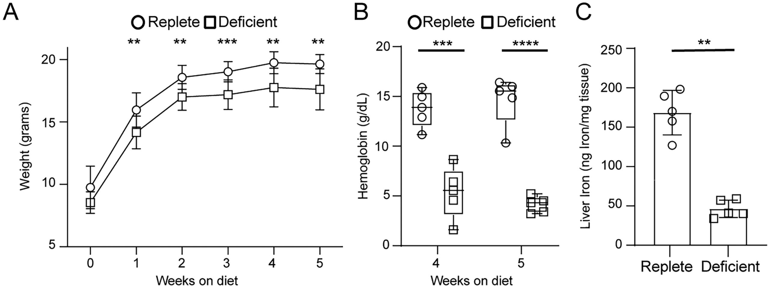 Figure 1: Mouse model of dietary iron deficiency. (A) Weight curves by weeks on iron defined diets for each cohort; boxes represent mean with bars representing standard deviation. (B) Comparison of hemoglobin by group at weeks 4 and 5 on defined diets. Bars represent mean and range with boxes depicting interquartile range. (C) Quantification of liver iron at diet week 5 for each cohort, box with bars represents mean with standard deviation. For all panels, n = 5 mice per group. All statistical testing via Mann–Whitney t test. ** = P < 0.01, *** = P < 0.001, **** = P < 0.0001.