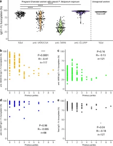 Figure 1: Fc fucosylation of naturally acquired P. falciparum-specific IgG depends on antigen location and exposure. a Fc fucosylation levels of total plasma IgG1 (gray, n = 127) and IgG1 specific for VAR2CSA (orange, n = 117), VAR6 (green, n = 121), and GLURP (blue, n = 88) in Ghanaian pregnant women (left four panels). Fc fucosylation levels of total plasma IgG1 from unexposed Dutch women (n = 5) were included for comparison (right panel). Medians and densities are shown. Statistically significant pairwise differences between antigen-specific IgG and total IgG (multiple two-sided Wilcoxon signed-rank tests with Bonferroni correction) are indicated (****P < 0.0001). b–e Correlations of b VAR2CSA-, c VAR6-, d GLURP-specific, and e total IgG1-Fc fucosylation levels with parity. P values and correlation coefficients are shown. Statistical significance of correlations (Spearman’s correlations. *P < 0.05; **P < 0.01; ***P < 0.001; ****P < 0.0001 (Larson, et al., 2021).