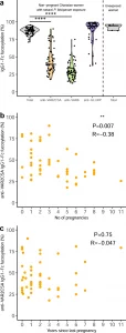 Figure 2: Fc fucosylation levels of VAR2CSA-specifc IgG is temporally stable. a Fc fucosylation levels of total plasma IgG1 (gray, n = 72) and IgG1 with specificity for VAR2CSA (orange, n = 50), VAR6 (green, n = 65), and GLURP (blue, n = 43) in non-pregnant Ghanaian women exposed to VAR2CSA during one or more previous pregnancies. Fc fucosylation levels of total plasma IgG1 from unexposed Dutch females (n = 5) are included as controls. Medians and densities are shown. Statistically significant pairwise differences between antigen-specific IgG and total IgG (multiple two-sided Wilcoxon signed-rank tests with Bonferroni correction) are indicated (****P < 0.0001). b Correlation between fucosylation levels of VAR2CSA-specific IgG1 and parity. c Correlation between fucosylation levels of VAR2CSA-specific IgG1 and time since last pregnancy. Statistical significance of correlations are shown (Spearman’s correlations. *P < 0.05; **P < 0.01; ***P < 0.001; ****P < 0.0001) (Larson, et al., 2021).