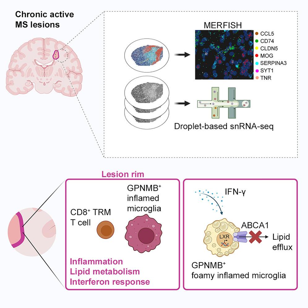 Researchers created a high-resolution single-cell and spatial map of chronic active MS lesions, areas of slow, ongoing damage surrounded by inflamed immune cells. Using single-nucleus RNA sequencing (snRNA-seq) and MERFISH spatial transcriptomics, they traced how immune niches form within these lesions.