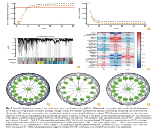 Using Weighted Gene Co-expression Network Analysis (WGCNA), the authors identified several co-expression modules correlated with vaccination. Among these, the blue, green, and red modules showed the strongest associations and were prioritized for downstream analysis. Network mining yielded 31 hub genes, many involved in interferon signaling, antiviral defense, and T-cell responses. Prominent hub genes included GBP1, GBP2, GBP4, GBP5, STAT1, STAT2, IFIH1, CXCL10, IRF1, IRF7, OAS1–3, PRF1, GZMB, TBX21, ZAP70, and others. These signatures reflect activation of type I interferon pathways, cytotoxic lymphocyte activity, and chemokine-mediated immune recruitment—hallmarks of effective vaccine responses.