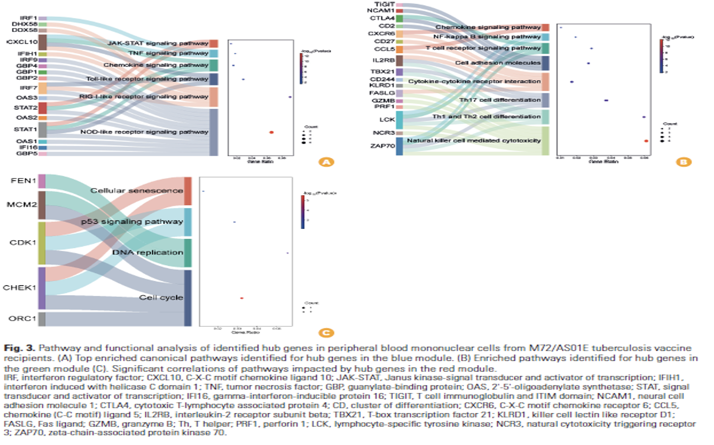 Overall, the study provides a comprehensive systems-biology framework identifying immune modules, hub genes, and regulatory interactions associated with the M72/AS01E vaccine. These findings highlight potential correlates of protection that warrant further validation in larger and more diverse cohorts.