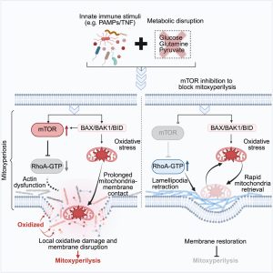 In many diseases, from infections to cancer, immune activation and nutrient scarcity occur at the same time. Yet these two stress signals have rarely been studied together. Now, researchers have uncovered what happens when they overlap: cells undergo a brand-new form of inflammatory cell death. Published in Cell, the study describes this process as mitoxyperilysis, a mechanism in which damaged mitochondria cluster near the cell membrane, unleashing bursts of oxidative damage that cause the cell to rupture. During infections or in growing tumours, the innate immune system is activated while local nutrients become scarce. The team combined these two conditions experimentally and observed something unexpected: mitochondria stopped roaming inside the cell and instead moved to the edge of the cell, remaining jammed against the membrane. Damaged mitochondria generate reactive oxygen species (ROS), which can destroy cellular structures. Positioned at the membrane, these ROS effectively “burn through” the cell surface, leading to rupture and cell death. The study revealed that the metabolic regulator mTOR is essential for this process. When mTOR was inhibited or genetically deleted, mitochondria stayed away from the membrane and cells survived. Innate immune signalling was equally crucial: deleting a key innate immune receptor prevented mitoxyperilysis from occurring at all. Together, these findings show that mitoxyperilysis requires both metabolic stress and immune activation, making it a highly specific cellular response. Because many cancers experience nutrient limitation and immune pressure, the researchers asked whether mitoxyperilysis could be therapeutically induced to kill tumour cells. In mouse models, they paired:
