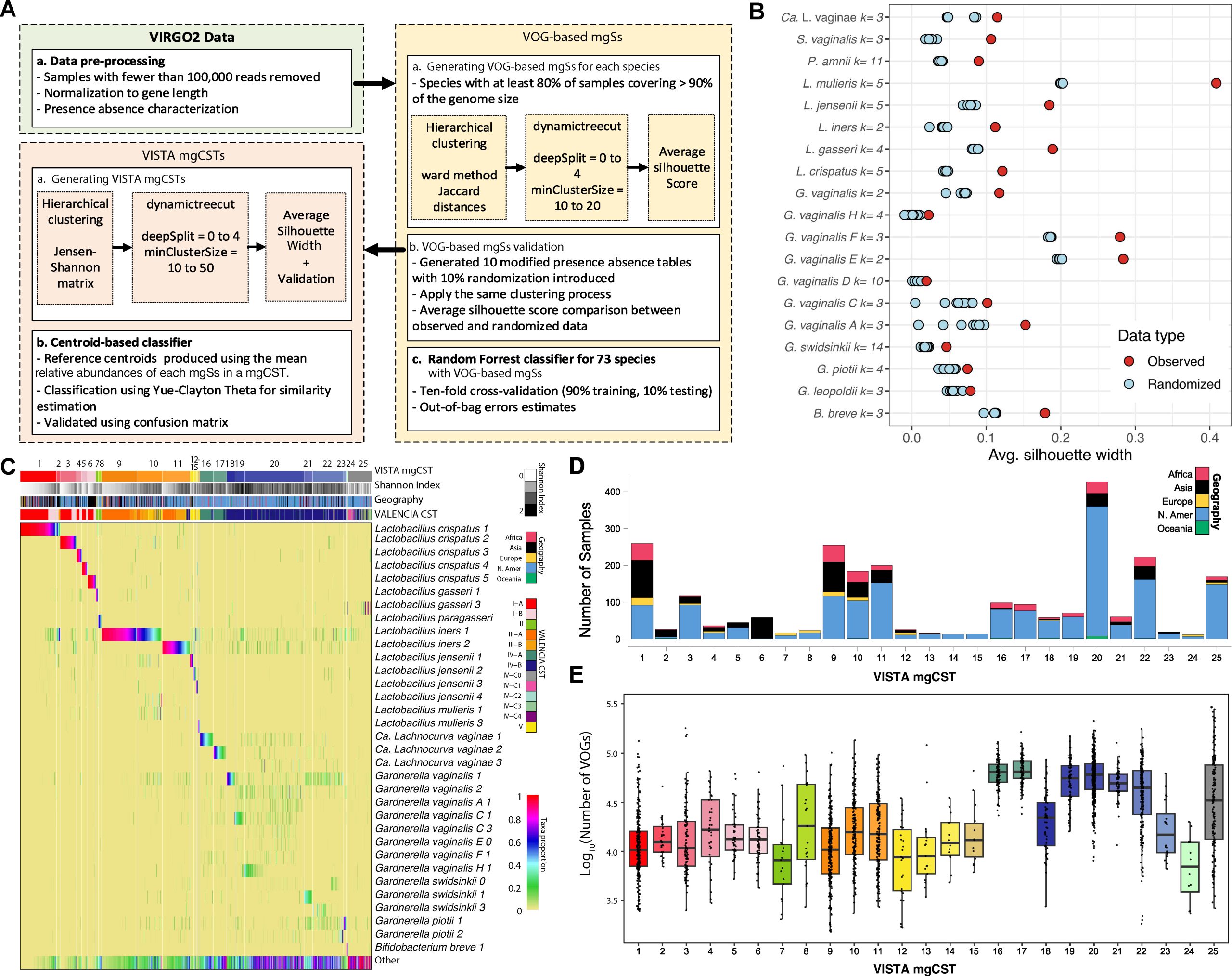 Figure 1: Development, composition, and prevalence of VISTA mgCSTs. (A) Flow diagram for construction of VISTA mgCSTs. (B) Comparison of VOG-based mgSs clusters generated from the observed and randomized data for selected species. (C) MgCST composition and basis of classification. It is important to note that “Ca. Lachnocurva vaginae” is referred to as UBA629 sp005465875 in VIRGO2, but as its genome has recently been completed, VISTA uses the newly assigned name. (D) Distribution and prevalence of mgCSTs by region where source data have originated. (E) The log10-transformed number of VOGs per sample, stratified by mgCST.